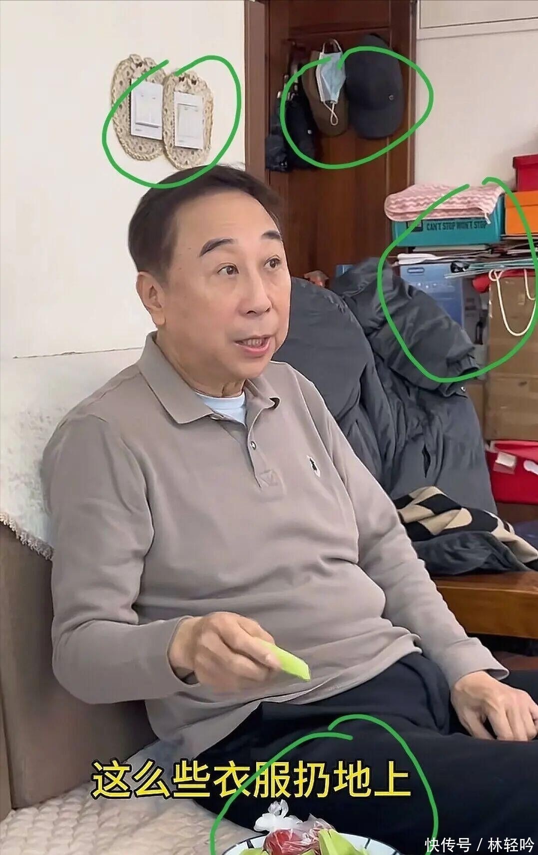 47. 家中陈设简单朴素,门口堆放着多个快递纸箱,门把手挂着旧雨伞和布帽子,用餐时常蹲坐在沙发边,把盘子搁在膝盖上,毫无明星做派。
